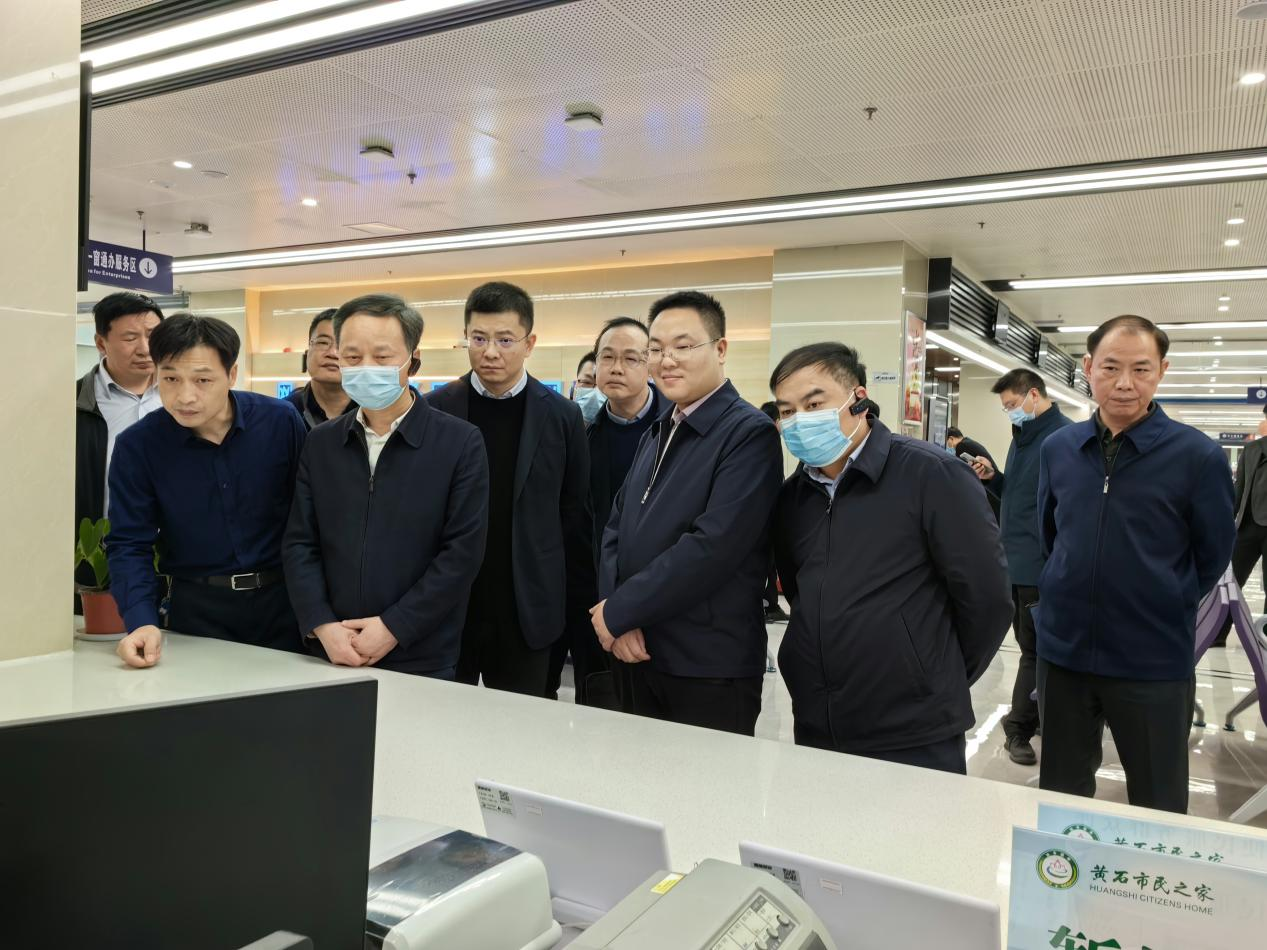 王世荣一行先后考察调研了黄石市民之家、大冶市政务服务中心、大冶市陈贵镇便民服务中心。王世荣一行重点考察了黄石市民之家“一窗通办”改革推进情况,了解了综窗平行受理、“一窗通办”平台建设、统一受理平台应用和“一业一证”改革推进情况;在大冶市,王主任重点考察了鄂汇办服务应用、自助服务体系建设等情况,询问了乡镇政务服务“三下沉”工作开展情况。